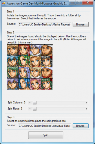 This is a simple splitting application that allows you to split large images into several pieces. Good for turning tilesets into individual tiles, facesets into individual faces, etc.
