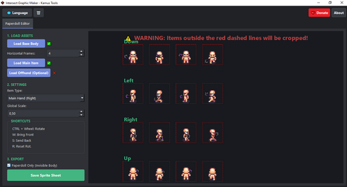 - Clean Export: Choose between exporting the full sprite sheet (Body + items) or the Paperdolls Only (items pasted onto a transparent body silhouette for layering in-game)